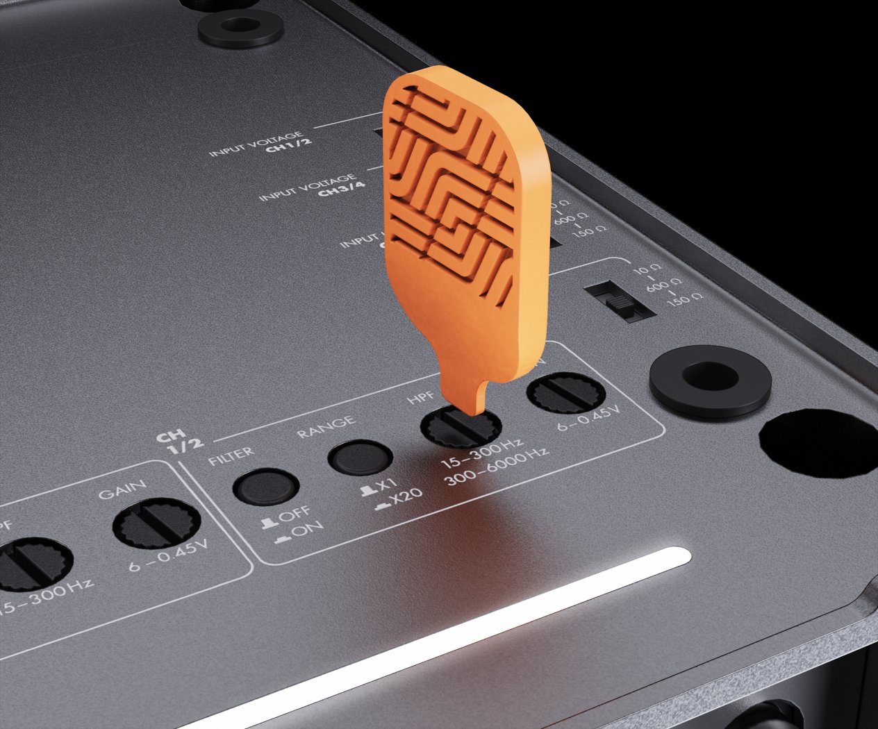 - Nastavitelný vysokoúrovňový vstupní odpor (zátěž EPS) pro každý pár kanálů: 10 / 150 / 600 Ω