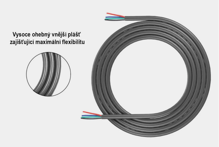 Kabel má vysoce flexibilní PVC plášť o průměru 7,5mm, který chrání vnitřní vodiče a usnadňuje instalaci.