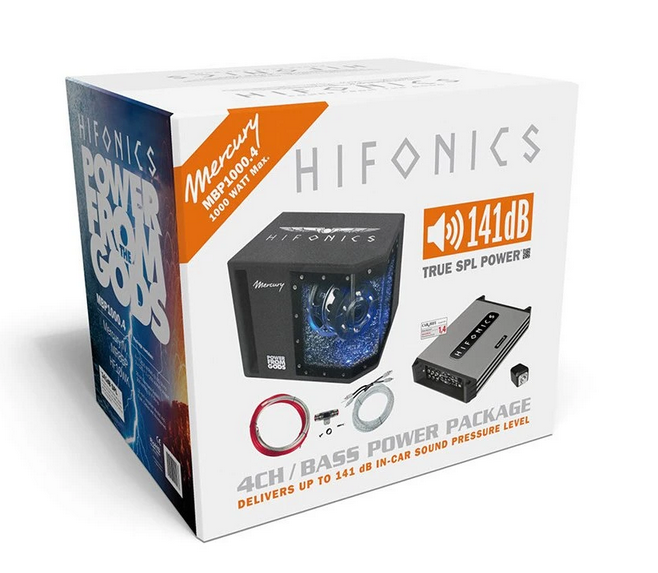 Hifonics MBP1000.4 je audio set „all-in-one“, obsahující 4kanálový zesilovač Hifonics Mercury IV, 20 cm (8″) subwoofer v pásmovém boxu MR8BP a instalační kabelážový kit HF10WK. Zesilovač dokáže pohánět jak hlavní reproduktory (2 × 125 W RMS na 2 Ω), tak subwoofer bridged (2 × 250 W RMS na 4 Ω). Subwoofer MR8BP s LED osvětlením dodává silné basy až 300 W RMS, a díky pásmovému boxu poskytuje kvalitní nízkofrekvenční výkon bez nutnosti externího subwooferu. Kompletní instalační sada zahrnuje silové, signálové i zemnící kabely a pojistku, takže je připraven k přímé montáži do auta.