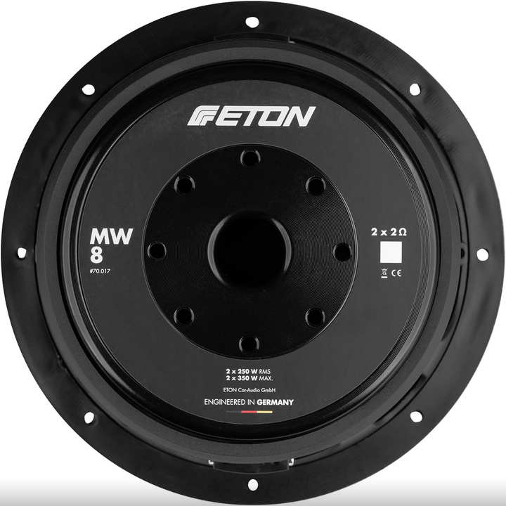 Subwoofer Eton MW 8 je univerzální 8″ měnič určený pro automobilové audio projekty a vlastní boxy. Disponuje dvojitou 2×2 Ω hlasovou cívkou, která umožňuje flexibilní konfigurace zapojení, a díky přesným konektorům a robustnímu koši je vhodný pro použití v uzavřených i bassreflex ozvučnicích. Konstrukce s extrémně tuhou papírovou membránou a velkými magnety zajišťuje vysokou odolnost i při vysokém výkonu.