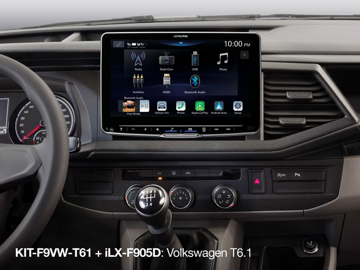Alpine KIT-F9VW-T61 je originální montážní sada navržená speciálně pro vozy Volkswagen T6.1 (Transporter, Caravelle, Multivan, California). Umožňuje profesionální instalaci 9" multimediální jednotky Alpine Halo do palubní desky bez nutnosti neodborných zásahů.