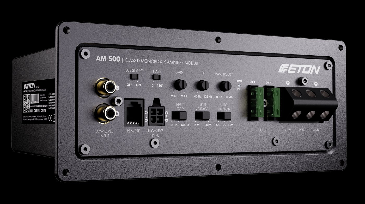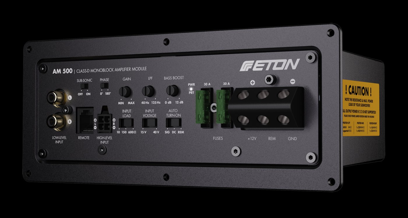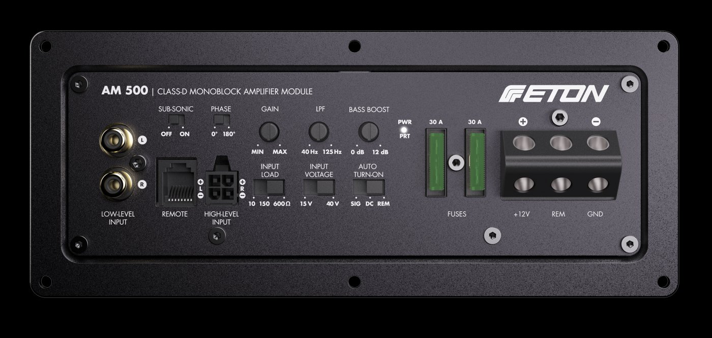 ETON AM500 je kompaktní monoblokový zesilovač třídy D, který poskytuje vysoký výkon a flexibilní ovládání pro subwooferové aplikace. Je umístěn v odolném tlakově litém hliníkovém pouzdru s chladiči, což zajišťuje stabilní provoz i při dlouhodobé zátěži.