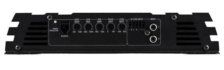 Model obsahuje nastavitelný bass boost (0–12 dB @ 40 Hz) a nastavení fáze (0–180°) pro přesné vyvážení výkonu s subwooferem. Součástí balení je kabelový dálkový ovladač basů pro pohodlné doladění přímo z místa řízení. Zesilovač také podporuje Automatic Turn‑On, high level vstupy (Hi‑Level) a RCA (low‑level) vstupy pro snadné připojení k různým typům autorádií.