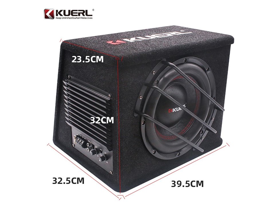 KUERL SP‑AB05 je aktivní subwooferový box s 10″ (250 mm) basovým měničem v uzavřené ozvučnici vhodné pro montáž v kufru či pod sedadlo vozu. Vestavěný zesilovač je optimalizován pro basový měnič a poskytuje 150 W RMS trvalého výkonu, což je dostatečné pro výrazné posílení nízkých frekvencí automobilového audio systému bez přídavného koncového zesilovače.